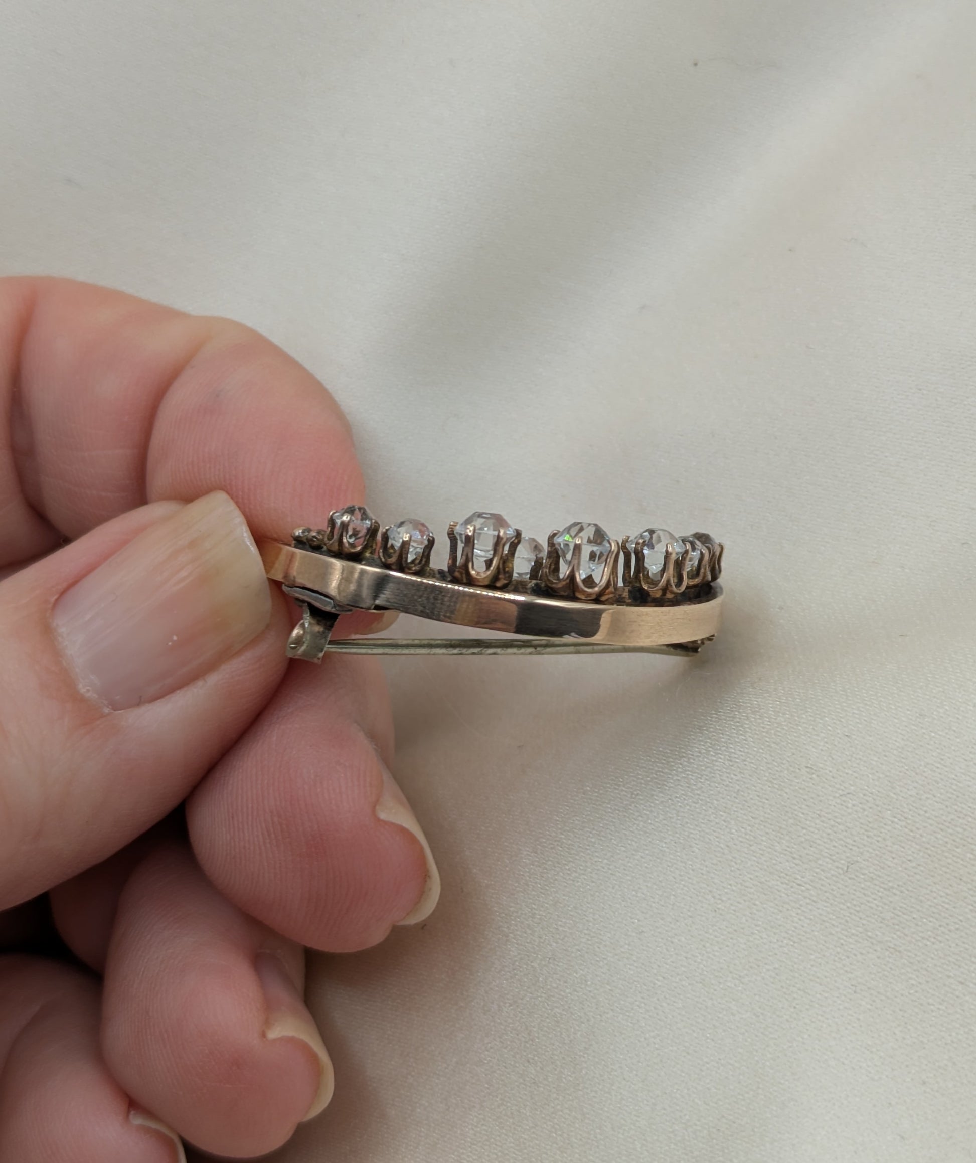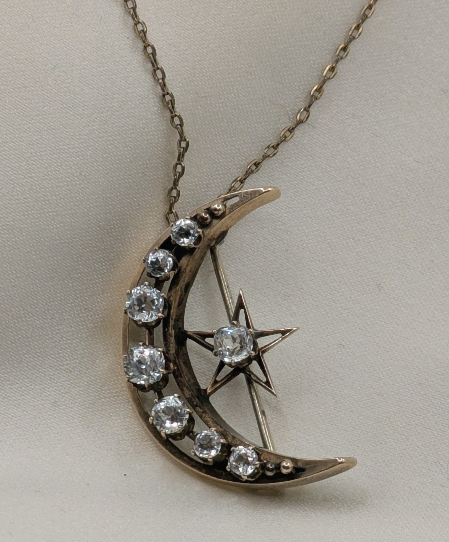 10k Victorian crescent Moon and Star Brooch Mine Cut Pastes