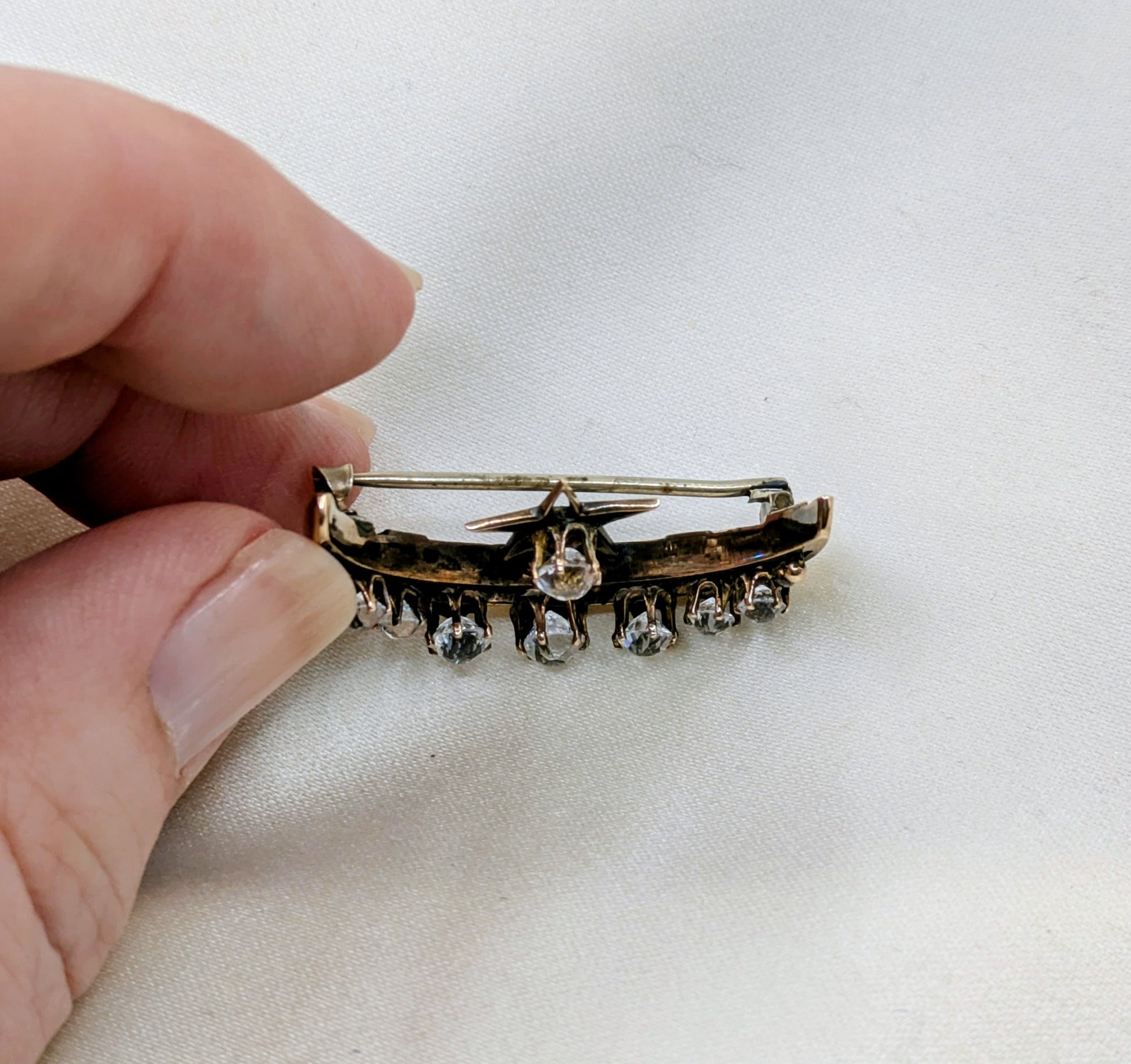 This sparkly brooch with a celestial theme was made in the late 19th century and has chunky mine cut paste stones! Although it was used as a well loved theme throughout the history of jewelry making, celestial motifs were especially popular during the late 1800s. This lovely example measures approximately 1 1/4" in length. Although unmarked, it tests to be 10k gold but the pin stem appears to be a different metal, perhaps steel. This was done for stability. The gold is a pinkish tone due to the copper used in the alloy. It could be worn on a chain as shown, or converted by your jeweler into a pendant. The pastes are in good condition for their age with slight wear to the facets when viewed under magnification.