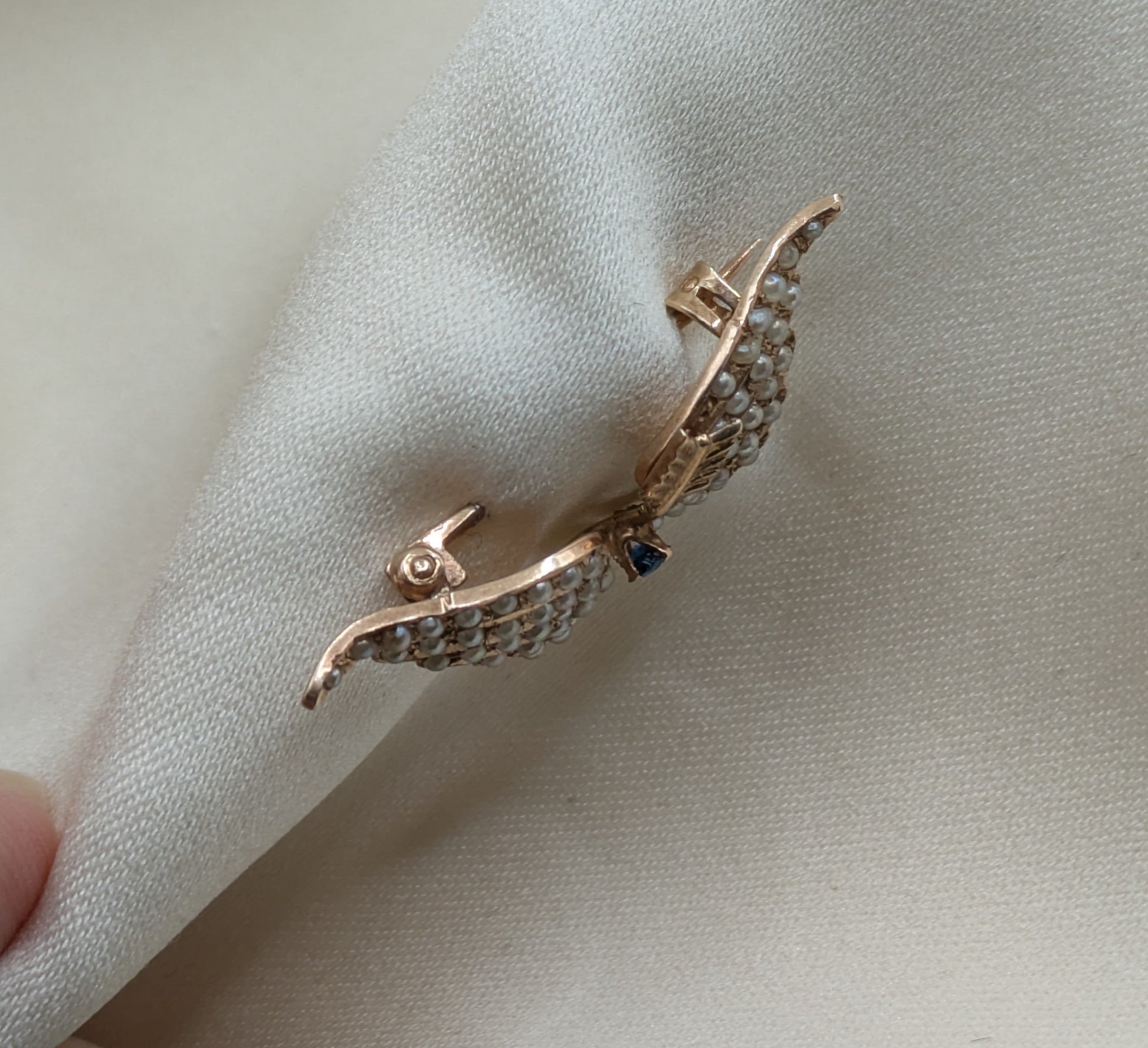Adorable Antique Victorian Edwardian Pearl Wings Brooch with Arrow and Stone 10k Gold