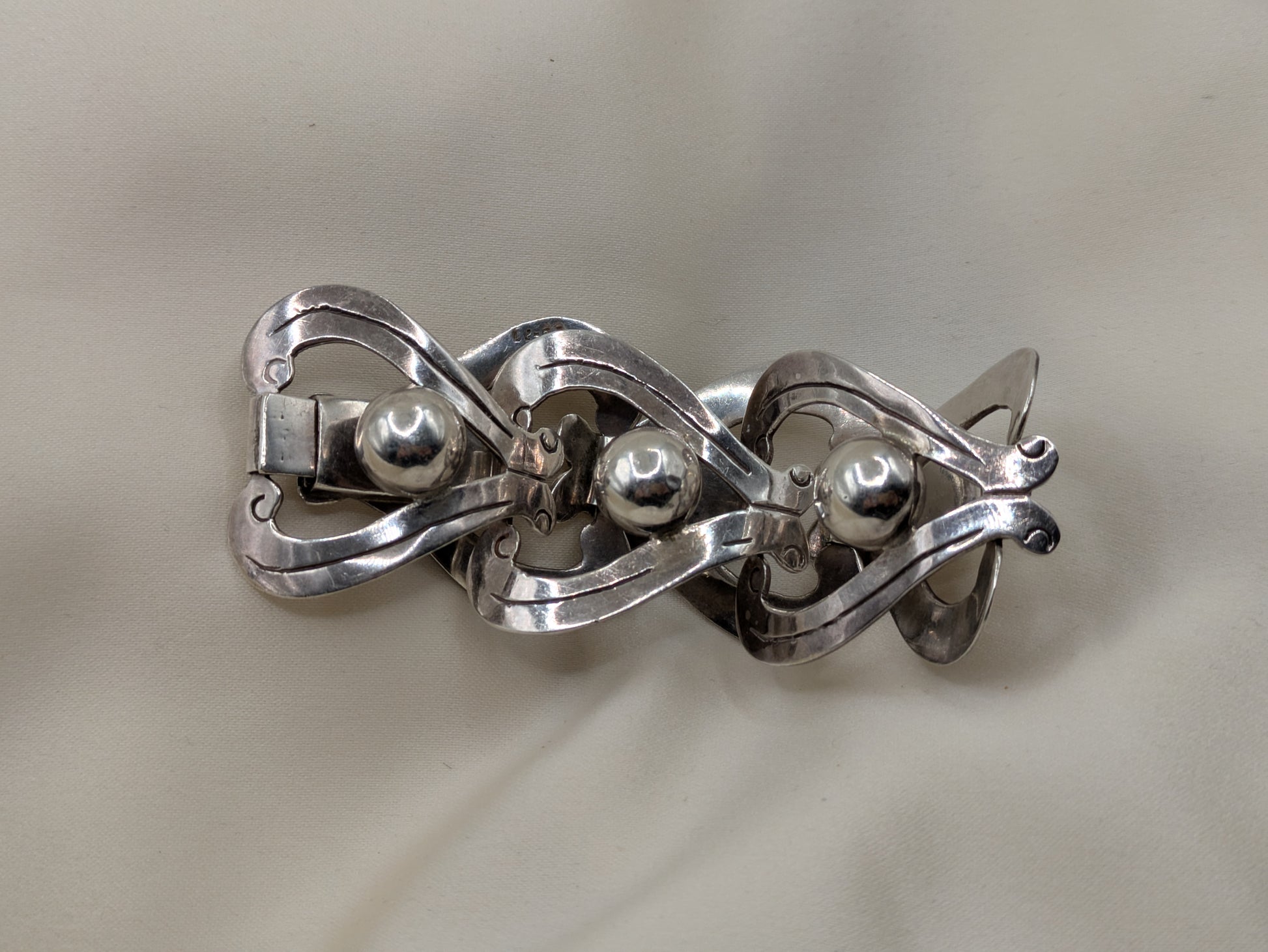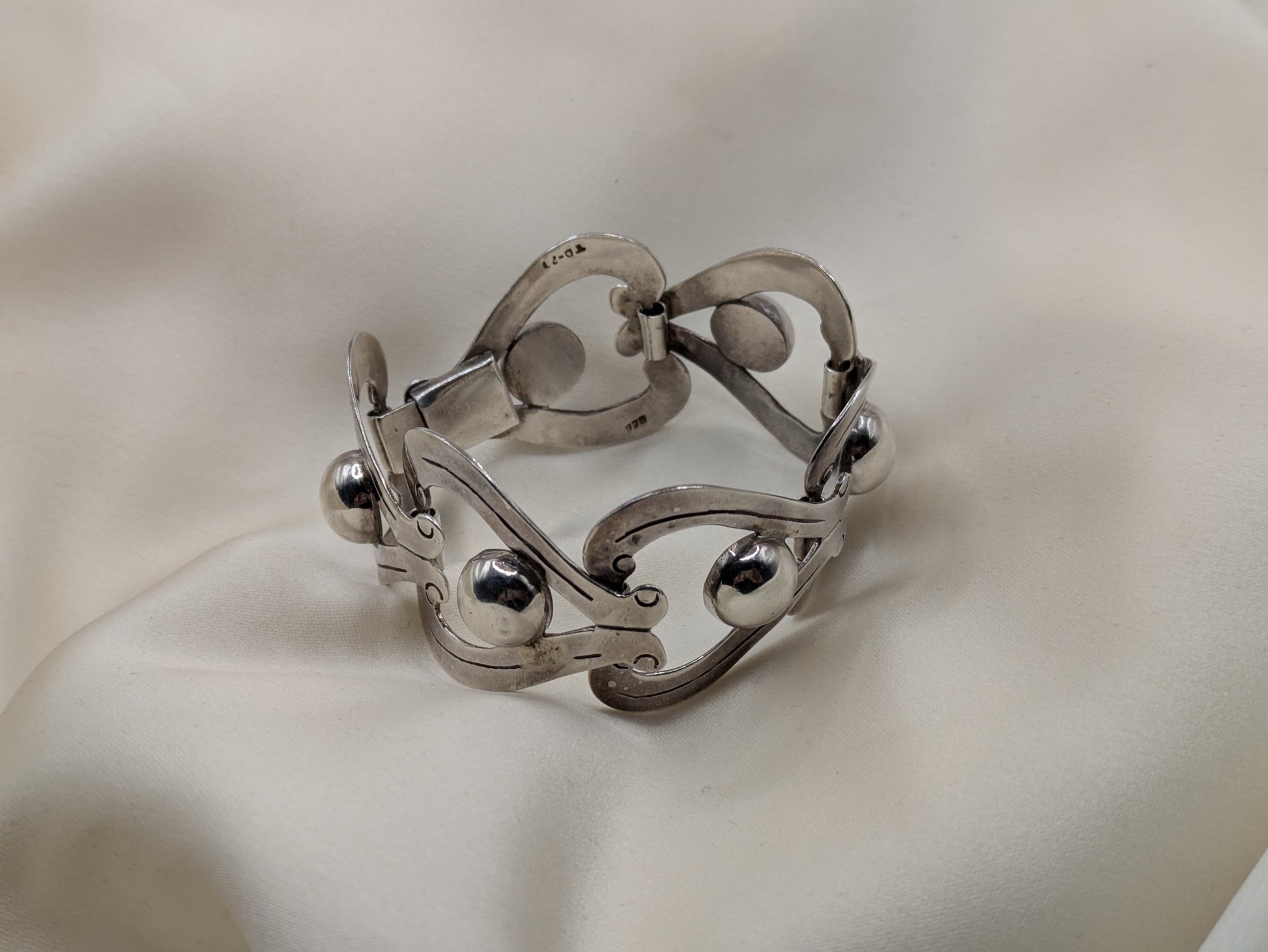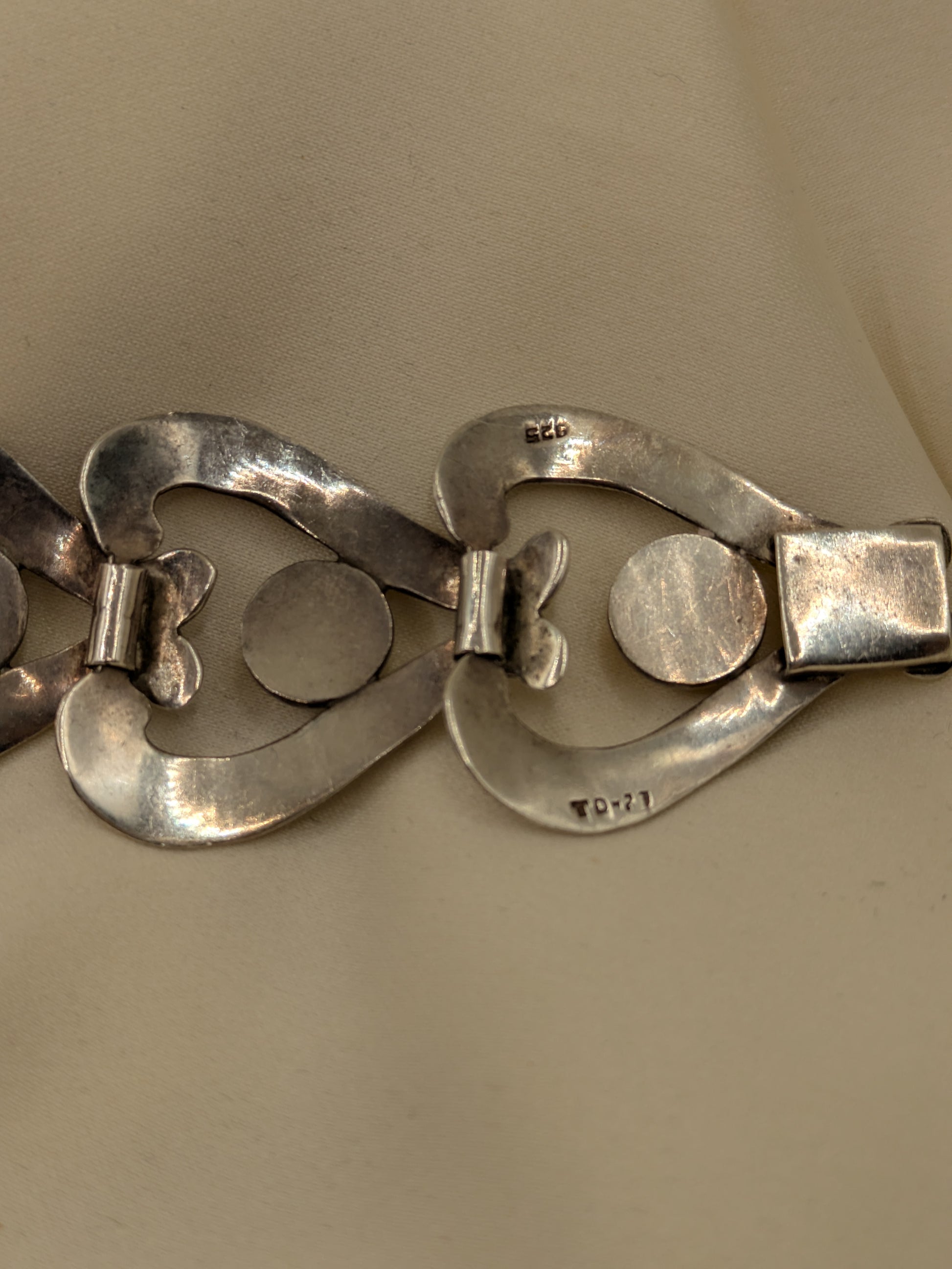 This bold and beautiful bracelet was made in Mexico. Mexico became a central location for the creation of sterling silver jewelry. Beginning in the early 1940s, workshops were started by William Spratling who trained local artisans in the art of silversmithing. From there the craft grew and many workshops opened, producing sterling silver jewelry with unique designs. This bracelet has great presence and is very wearable!
