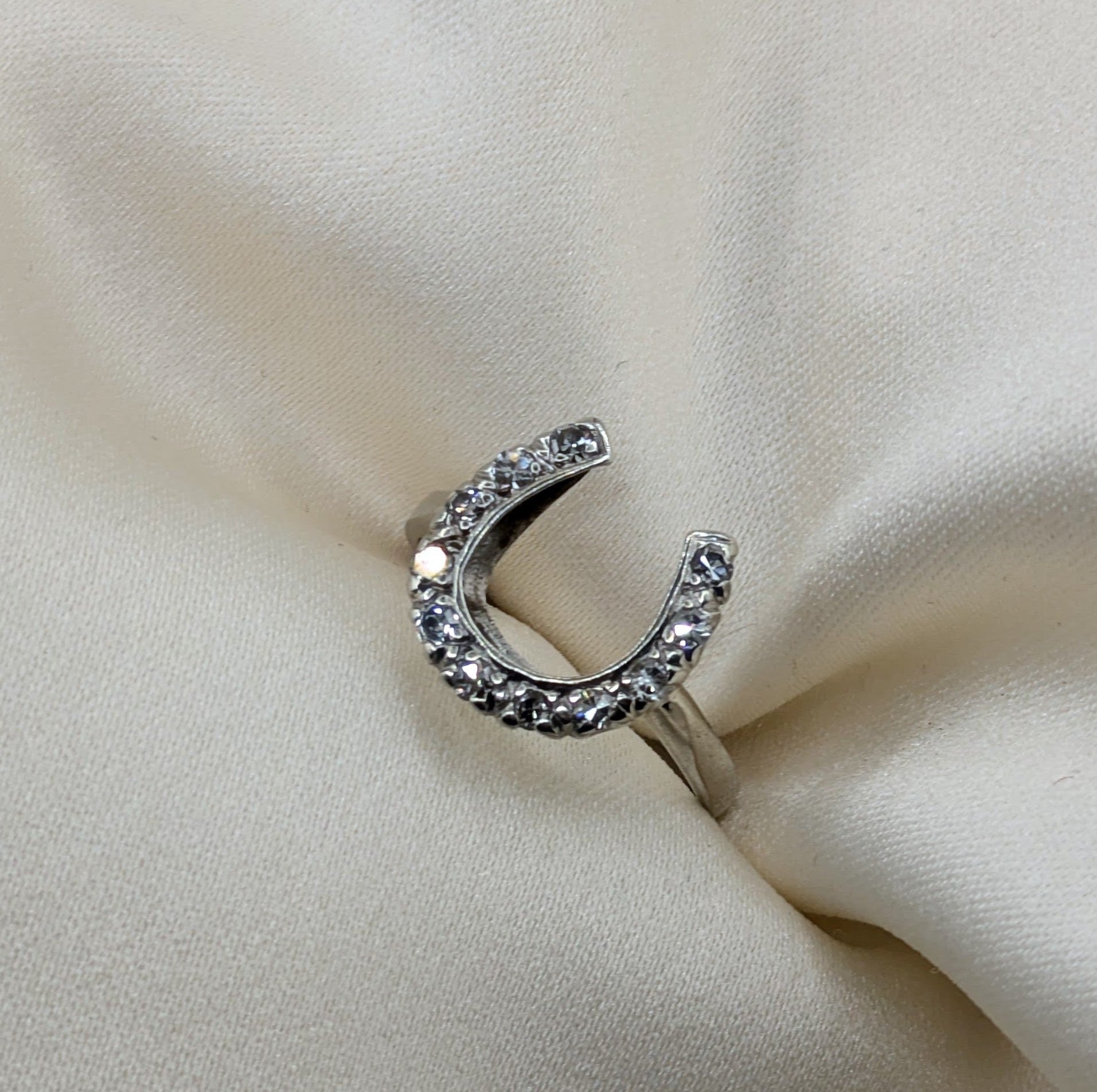 This estate 14k white gold horseshoe ring will be your everyday go to jewel! The horseshoe has been a symbol for good luck since ancient times since it is associated with the crescent moon shape, which symbolized the protection of the goddesses. This ring has 11 "single cut" diamonds which are fully faceted stones with a cutelet and table. They feature 17 facets and were used until about the 1940s. White gold was successfully formulated in the early 20th century and first patented in Germany in 1912. It soared in popularity in the 1920s as an alternative to platinum. Its popularity increased during world war II when Platinum was needed for the war effort.