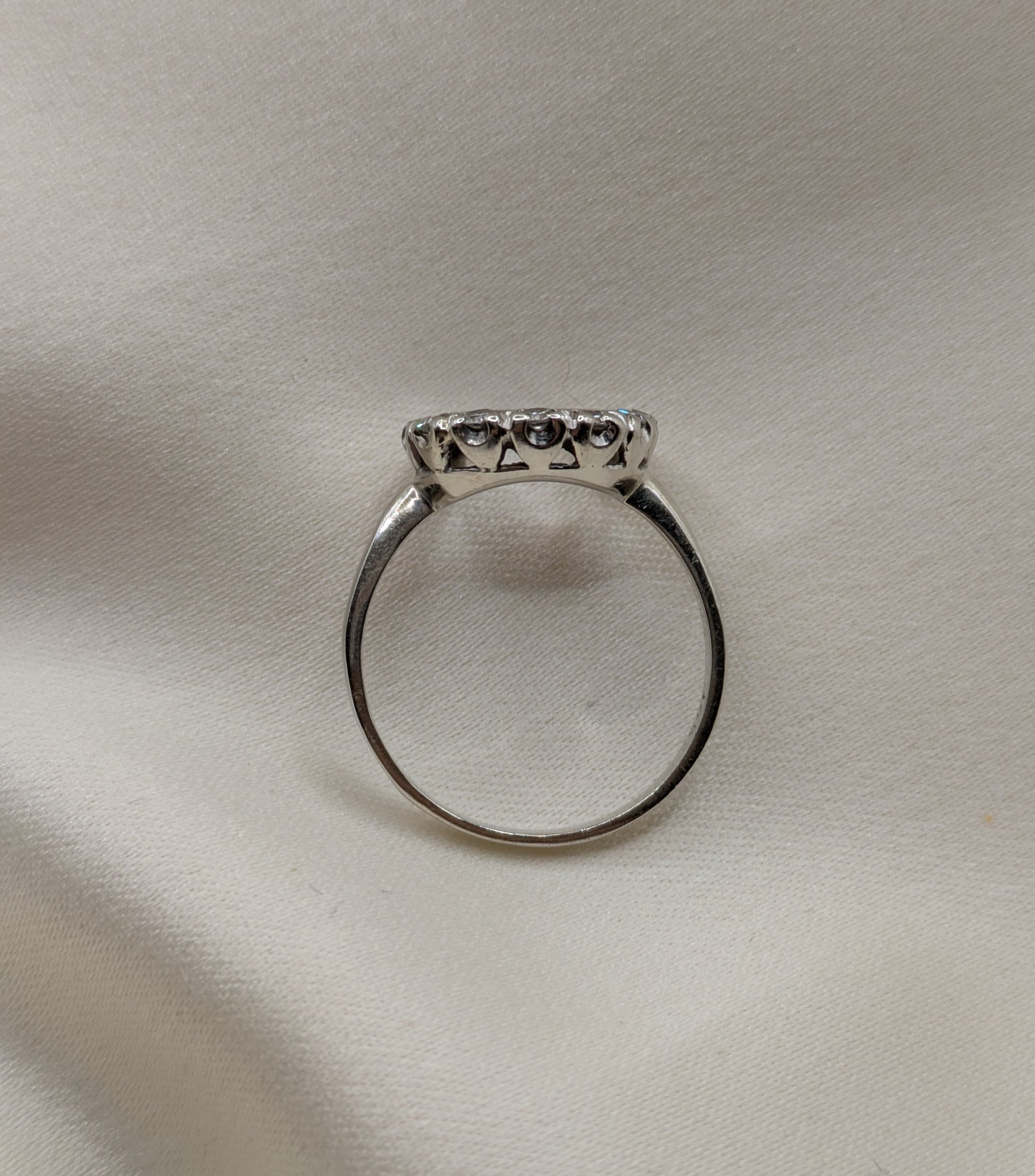 The ring is a size 7 3/4. One diamond has a tiny chip on the outer girdle and visible inclusion under 10 x loupe. The others are clear under 10x.