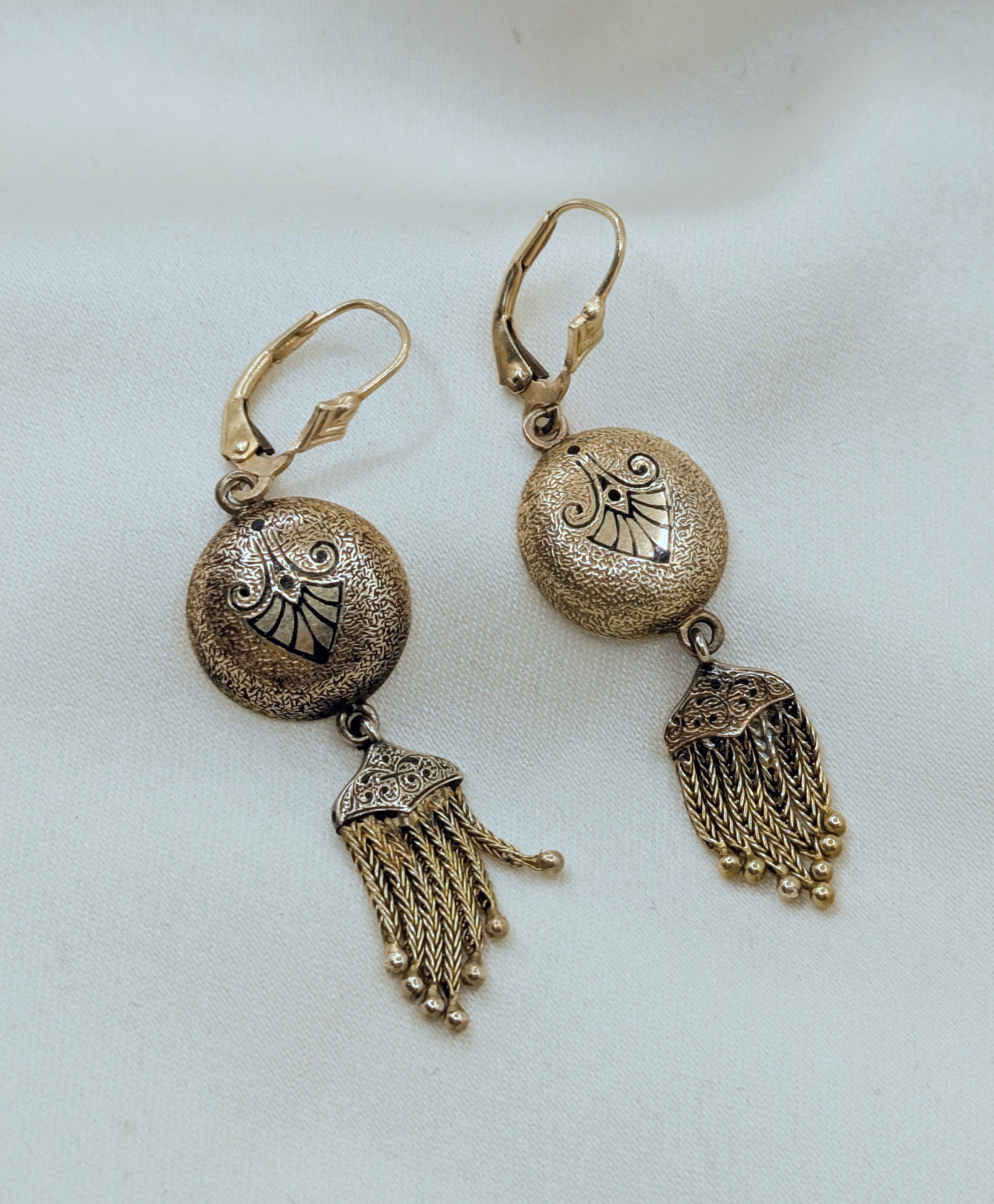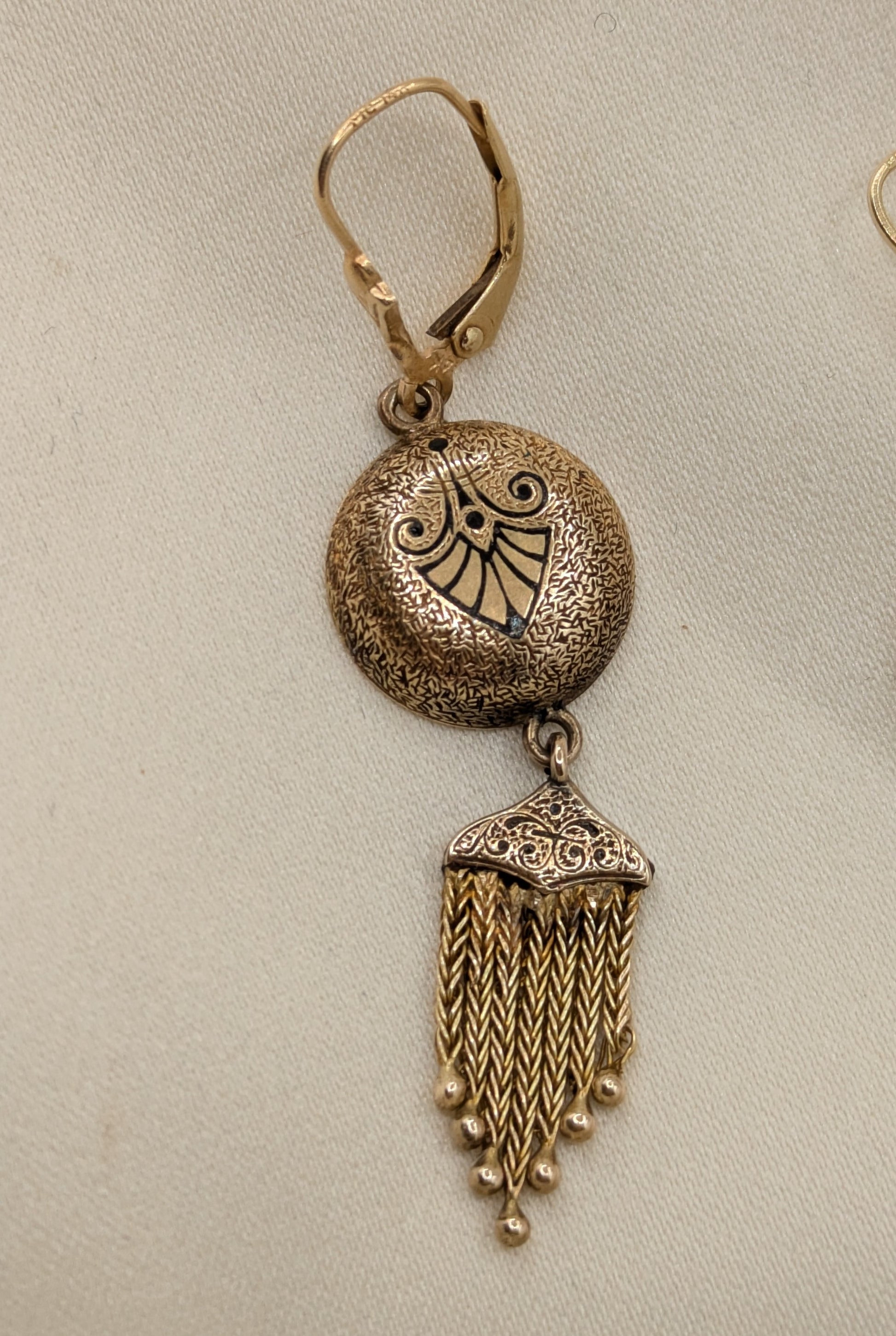 These flirty foxtail fring earrings will be the highlight of your holiday outfit! During the mid Victorian period, the jewelry was big and bold to compliment the heavier fabrics of the day. The earrings feature black tracery enamel other wise known as taille d'epargne, which was accomplished by making shallow engravings which were them filled with enamel. Enamel is powdered colored glass which must be fired at high temperature to metal, usually gold, silver or copper. The earring surface is hand chased and covers the entire surface, as was commonly done during this period of decorative embellishment! The lever backs are not original, however the fanned design mirrors the one in the earring.